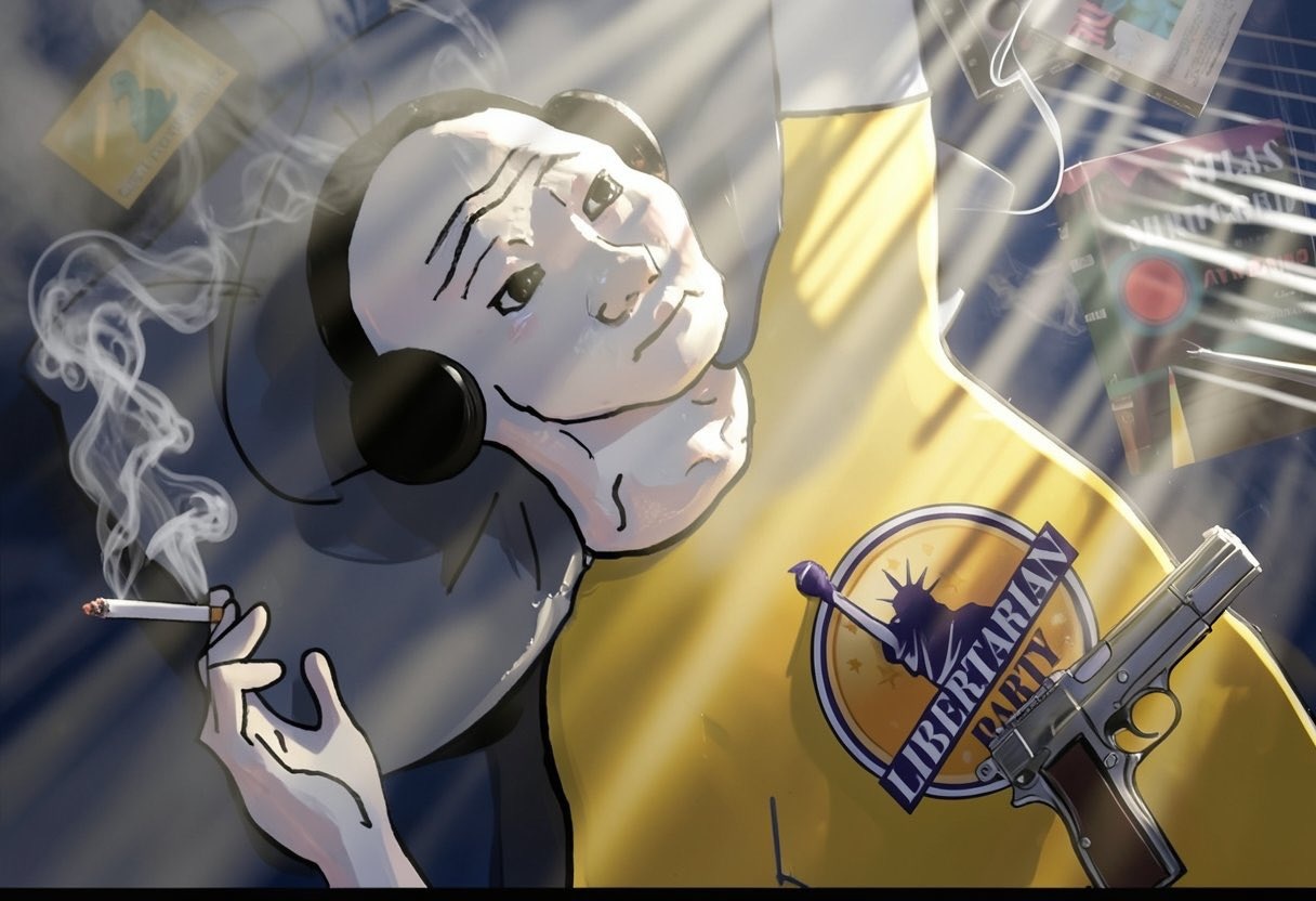 Libertarian Wojak chills on his bed loving the 2nd Amendment — farm.meme