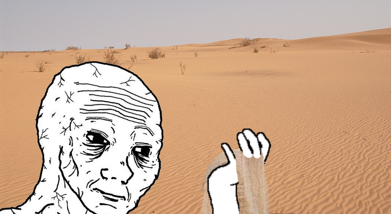 Wojak in the desert with sand falling through his hands is a Wojak meme uploaded to farm.meme on April 20, 2026 by Big Dog. It belongs to our growing Wojak collection of 876 memes.