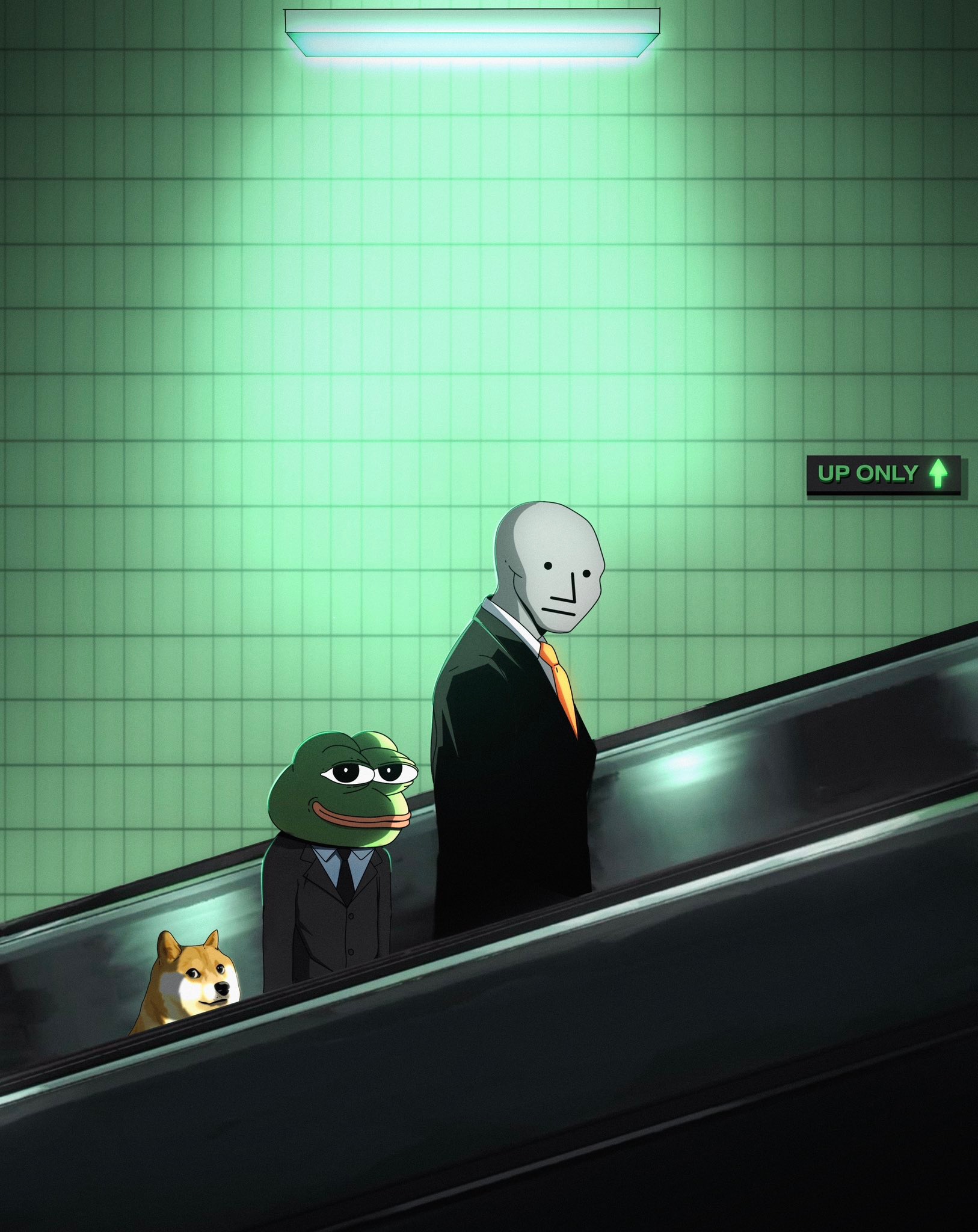 Doge, Pepe, and NPC taking the escalator Up Only — farm.meme