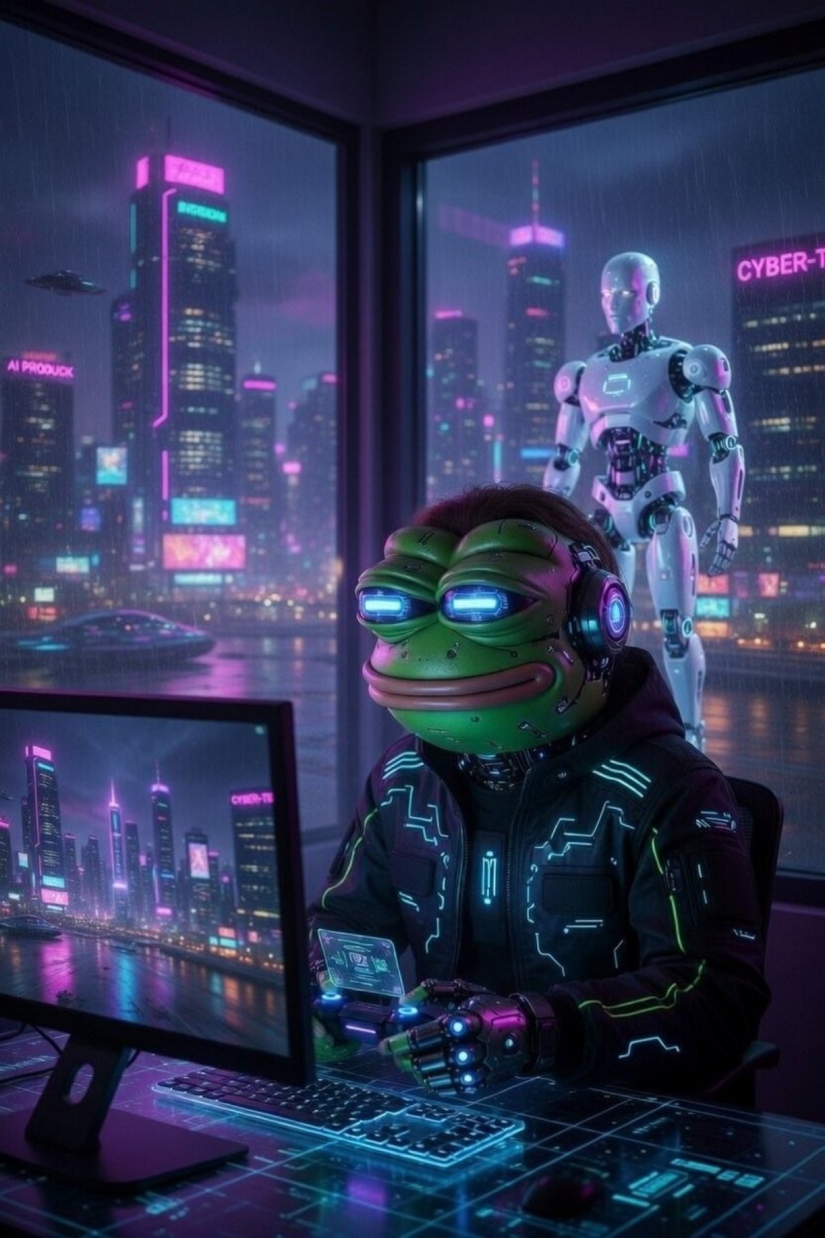 Cypherpunk Digital Pepe in a futuristic city — farm.meme
