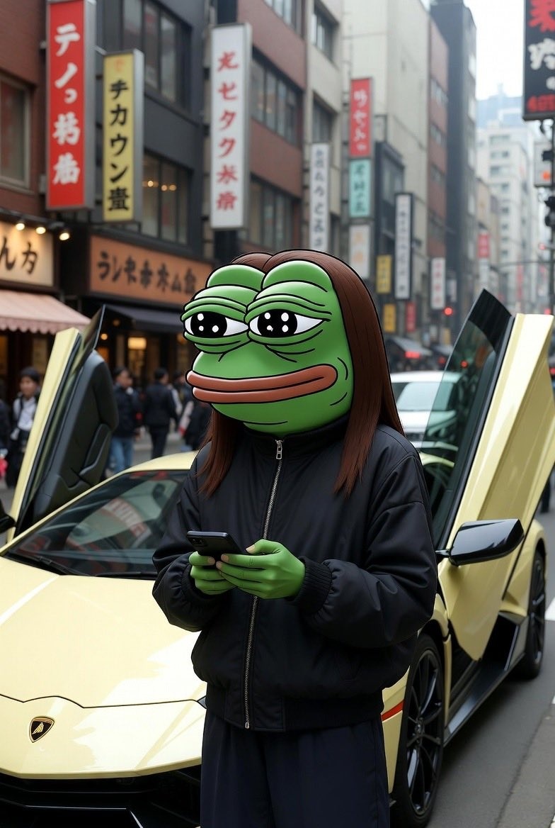 Asian long haired Pepe with a yellow lambo — farm.meme