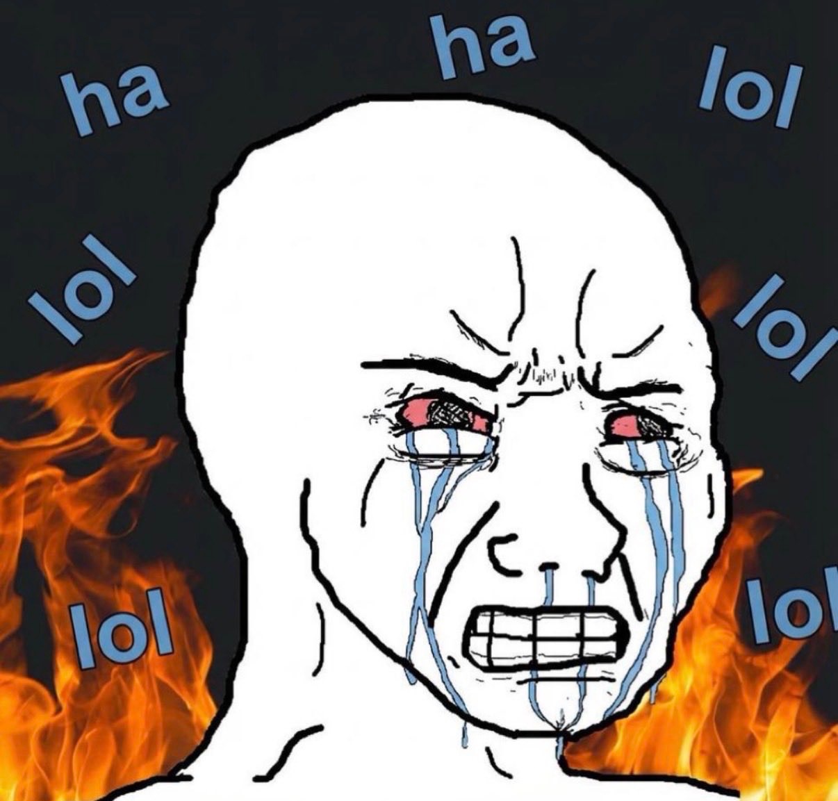 haha lol crying seething wojak with fire background laugh — farm.meme