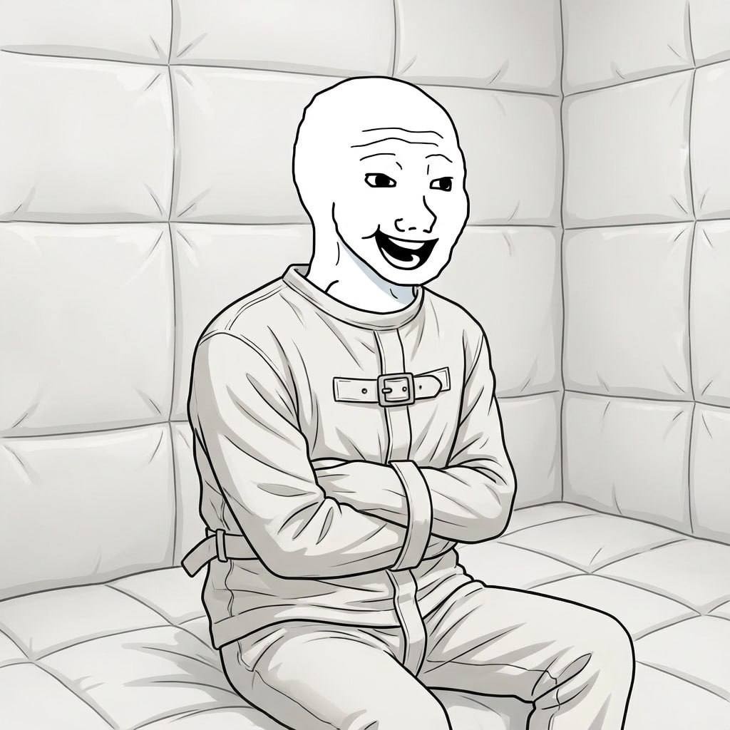 Wojak in a straitjacket, padded walls. — farm.meme
