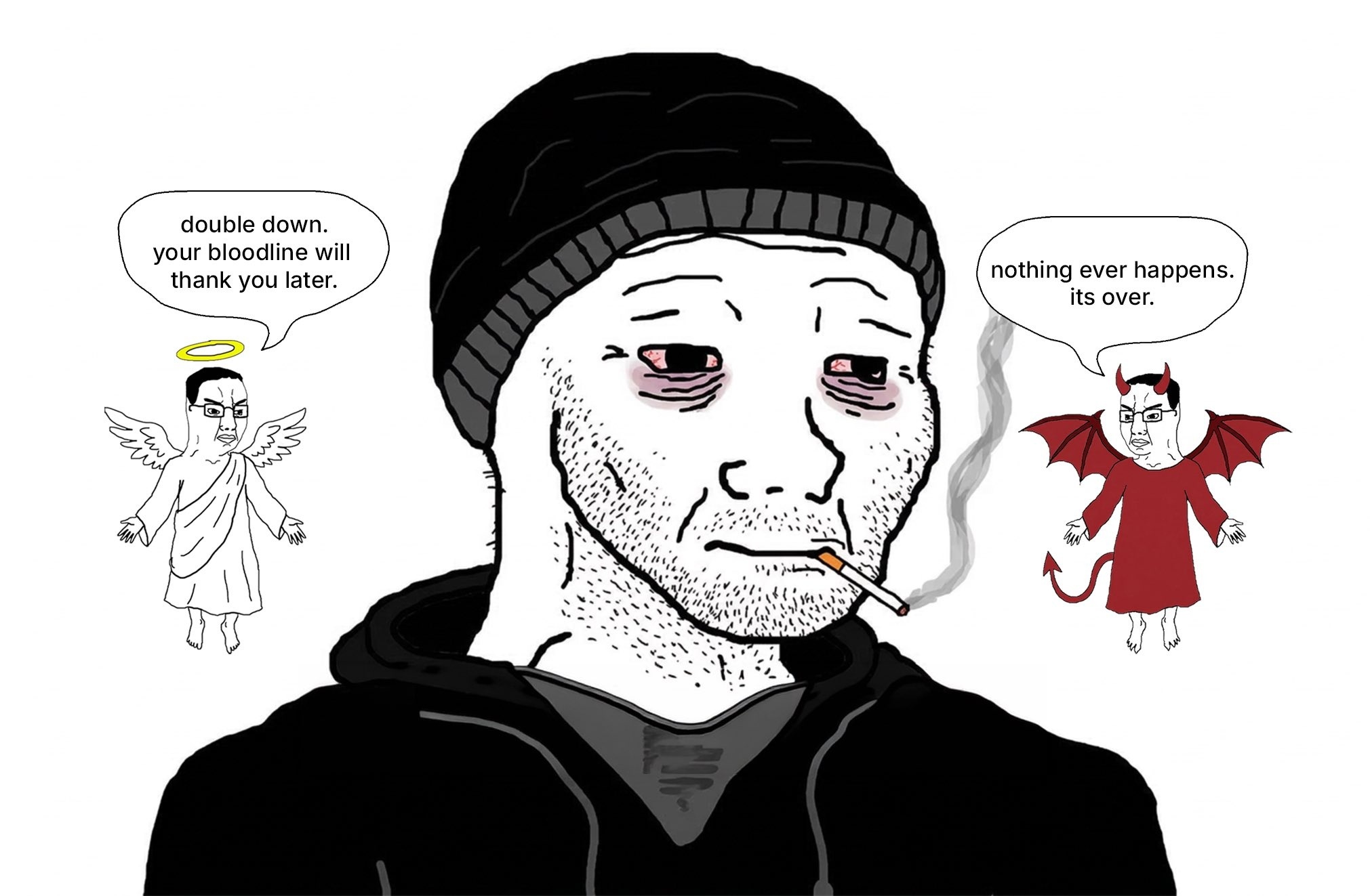 Chud Angel and Devil on Doomer Wojak’s shoulders — farm.meme