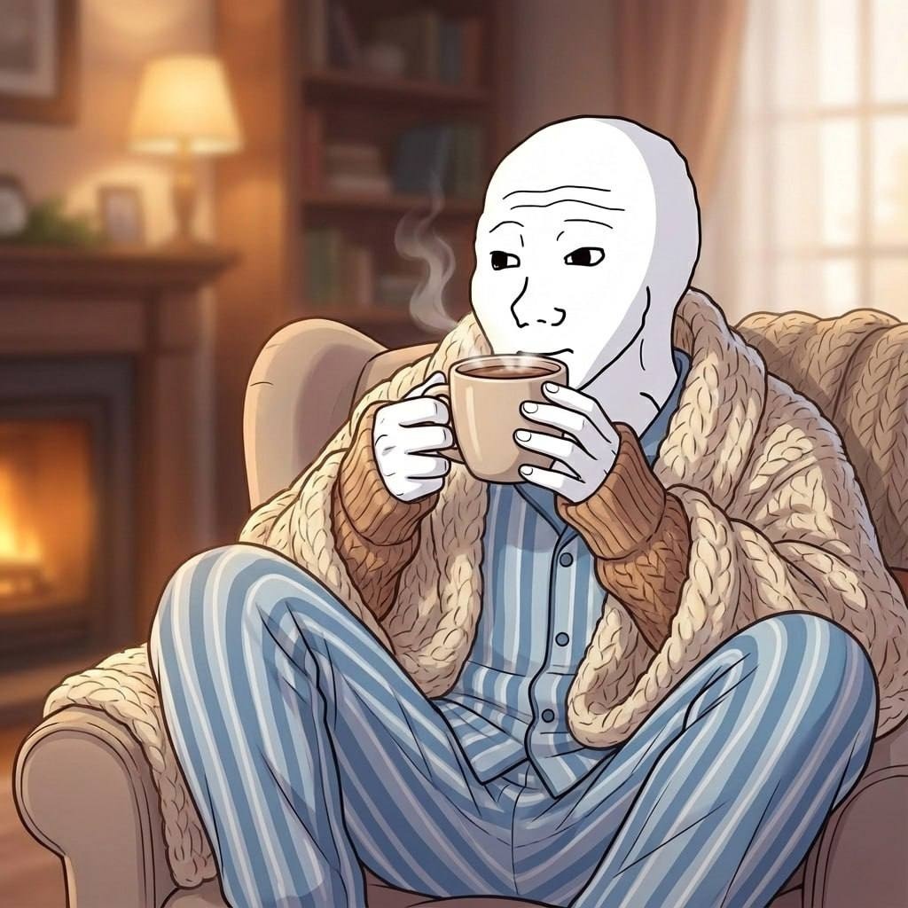 Comfy Wojak sipping a coffee at home